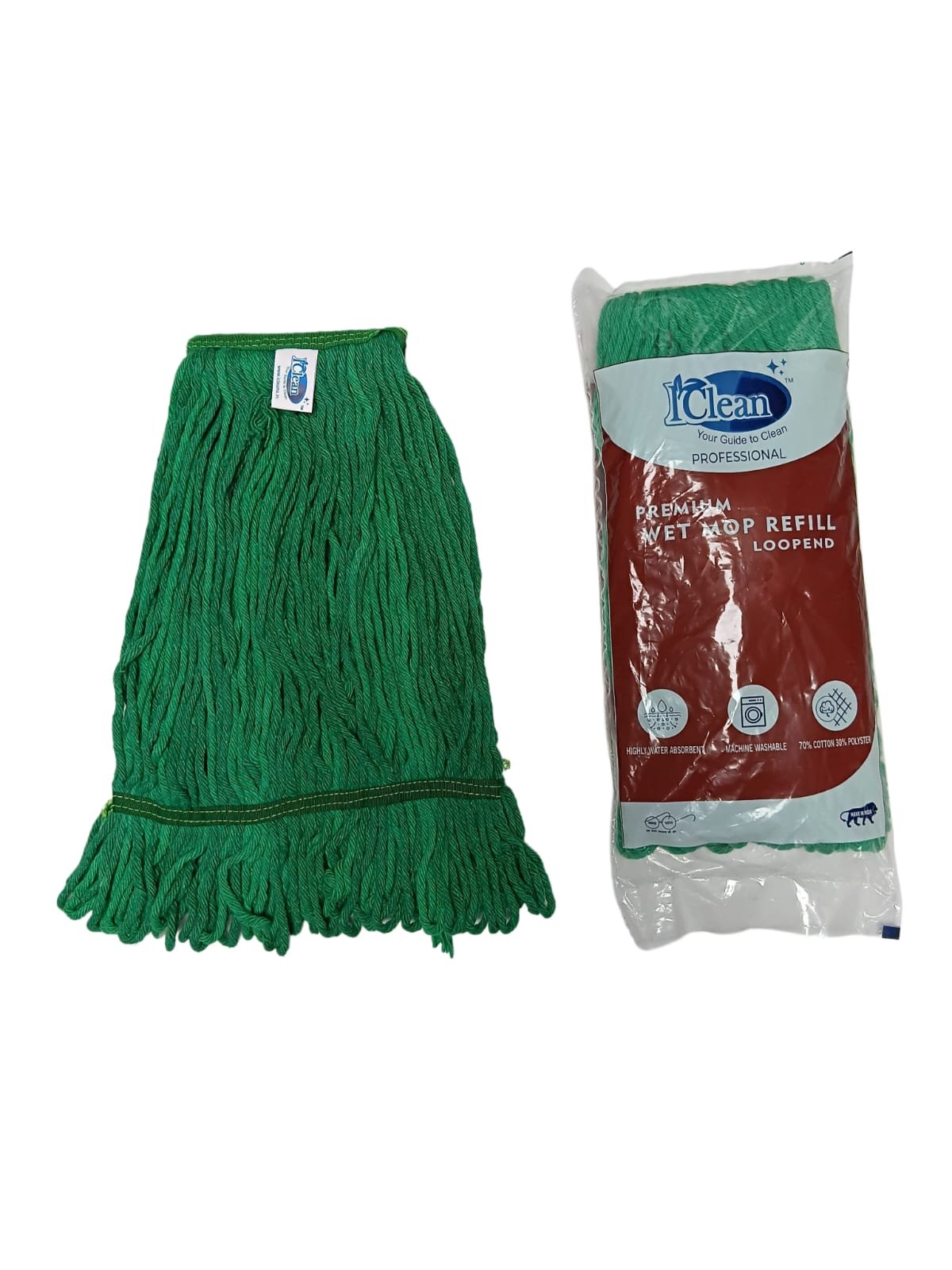 The iClean wet mop refill loop-end green color is a high-quality cleaning accessory designed for effective and hygienic floor maintenance. Made from durable, highly absorbent cotton fibers, this mop refill quickly removes dust, dirt, and liquid spills, leaving floors clean and streak-free.